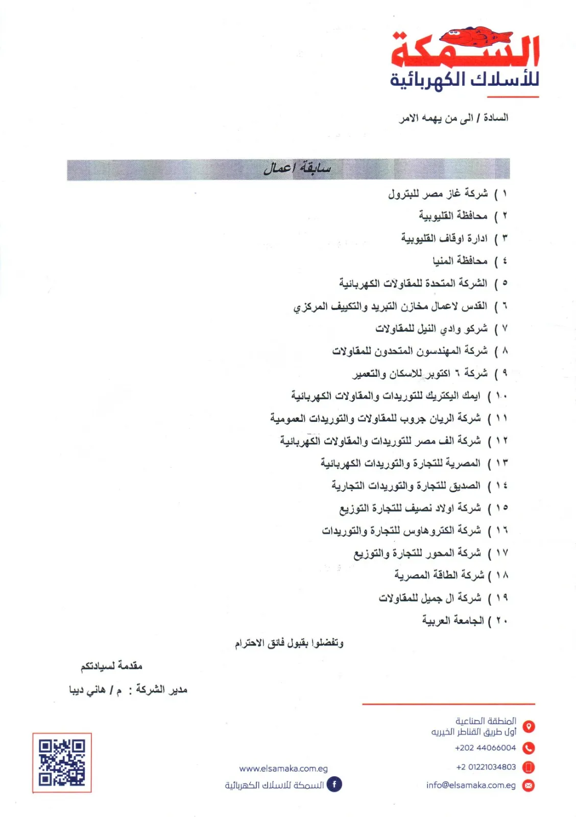 تحظي مؤسسه السمكه للاسلاك الكهربائيه بتاريخ مشرف في التعامل مع كبار العملاء حيث قدمت اجود الاسلاك والكابلات والخراطيم الكهربائيه لكثير من القطاعات الحكوميه والخاصه